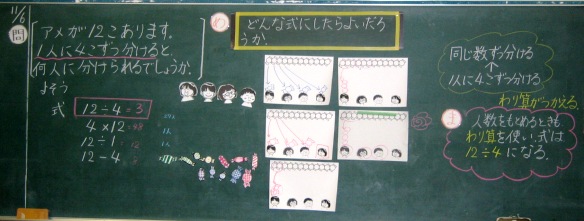 今日は校内の提案授業でした。わり算の包含除の導入をしました。じっさい,包含除・等分除と聞いてピンと来る人はそういないと思います。でも,この二つってちがうんです。